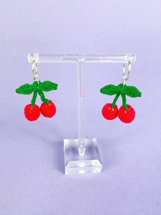 Mini Cherry Crochet Bead Hoop Earrings in Red
