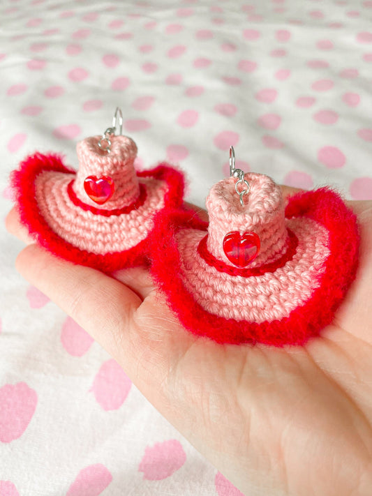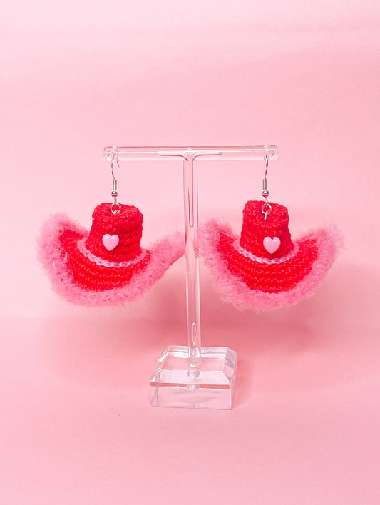Cowboy Hat Statement Crochet Earrings in Pink and Red