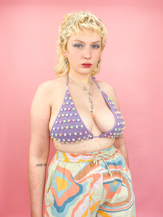 Star Beaded Crochet Bralette in Purple - Size UK 12-14
