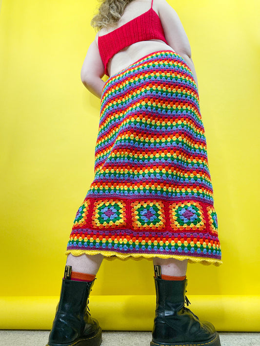Bright Rainbow Crochet Midi Skirt with Granny Squares